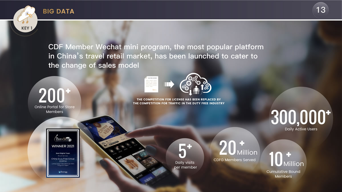陳國強表示,"我們推出了基于會員的線上平臺cdf會員購,此外還積極迎合銷售模式的變化,推出了基于中免2000多萬會員的會員小程序,在流量為王的時代建立了中國旅游零售市場最大的流量平臺。"他介紹稱,"通過兩年多的運營,該會員小程序日活躍用戶達30多萬,成為中免甚至是中國旅游零售重要的流量平臺,未來機場口岸的客流恢復后還將成為打通中免線上線下的重要流量入口。"這一舉措也得到了業(yè)內的高度認可,榮獲穆迪2021年度最佳數(shù)字團隊獎。