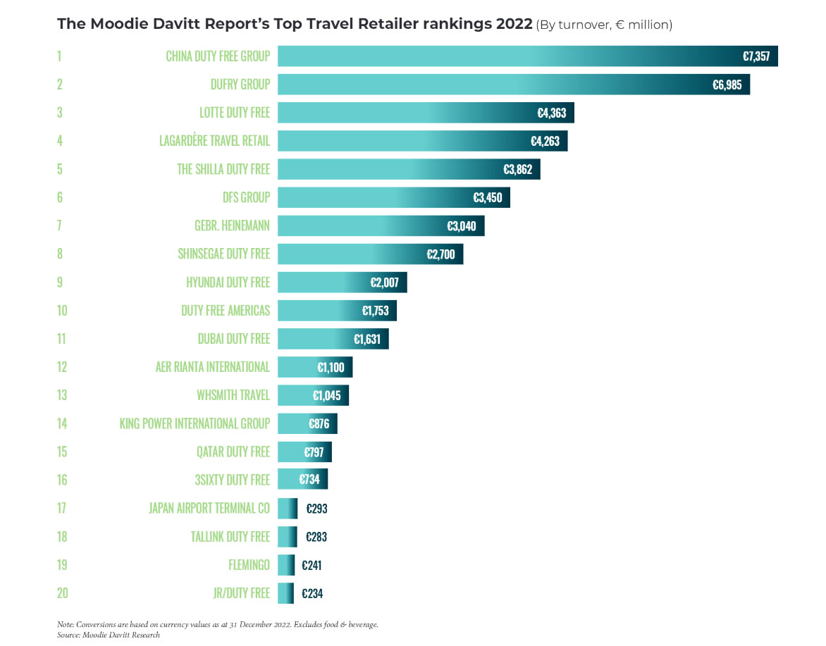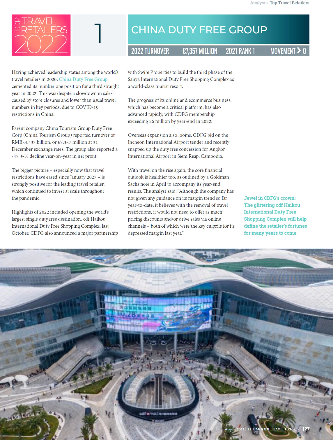 2023年8月28日,全球旅游零售行業權威媒體《穆迪達維特免稅報告》(The Moodie Davitt Report)發布《全球領先旅游零售商報告》,對過去一年來全球前20名旅游零售商展開了跟蹤評估。報告顯示,根據2022年營業額統計,中免集團連續第三年在全球頂級旅游零售商中保持領先地位,成為2022年全球最大旅游零售商。