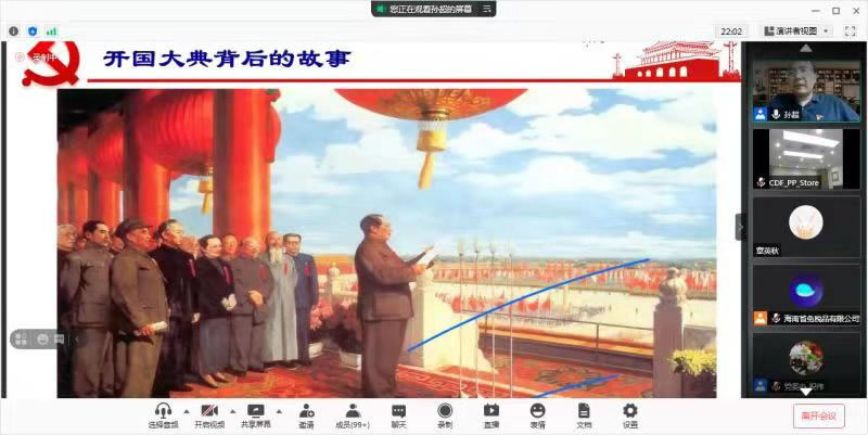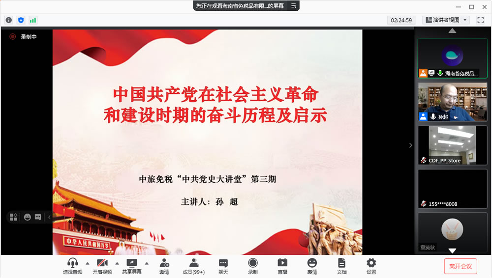 2021年5月27日,中旅免稅黨委舉辦第三期“黨史大講堂”專(zhuān)題培訓(xùn)。根據(jù)中旅免稅黨委“黨史大講堂”培訓(xùn)工作安排,此次活動(dòng)由海南省免稅品有限公司黨委組織承辦,海南省免稅品有限公司黨委班子成員和機(jī)關(guān)黨支部全體黨員在會(huì)議室集中參加線上培訓(xùn),中旅免稅其他各級(jí)黨組織黨員和入黨積極分子共600余人通過(guò)視頻方式線上參會(huì)。