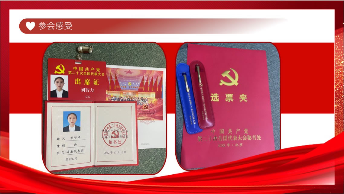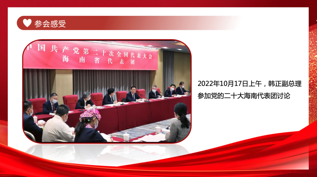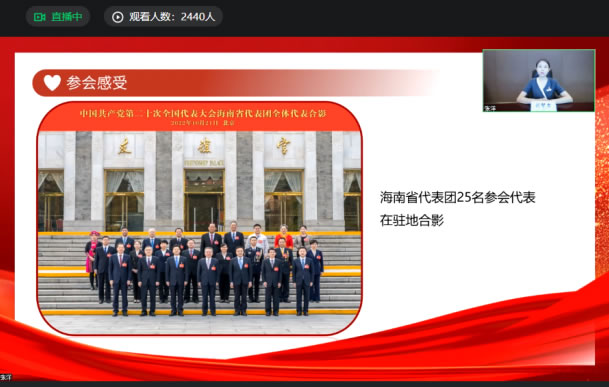 宣講會上,她分享了參加黨的二十大的所見所聞所感,并從新時代青年、基層黨員、海南旅游零售行業從業者三個身份,就如何貫徹黨的二十大精神分享學習體會。