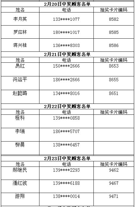 每日中獎名單公布如下: